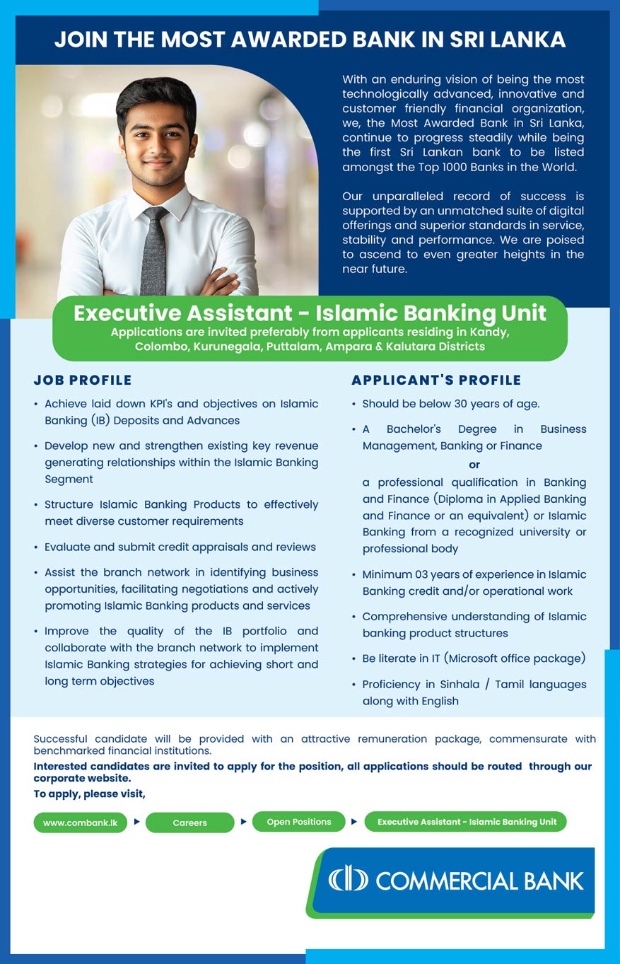 Commercial Bank Job Vacancies 2026 called for Executive Assistant (Islamic Banking Unit). Eligible candidates can be apply for this opportunities.