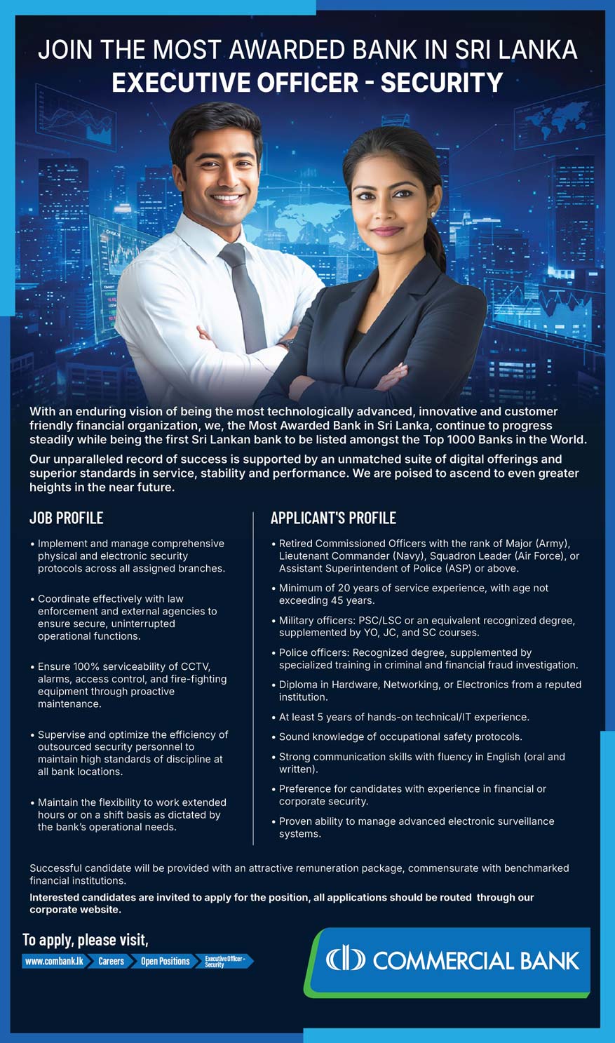 Commercial Bank Job Vacancies 2026 call for Executive Officer (Security). Interesting candidates can be apply for this opportunities.