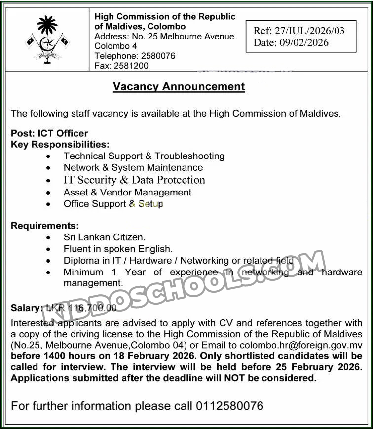 High Commission of Maldives Job Vacancies 2026 called for ICT Officers. Interested candidates can be apply for this opportunities.