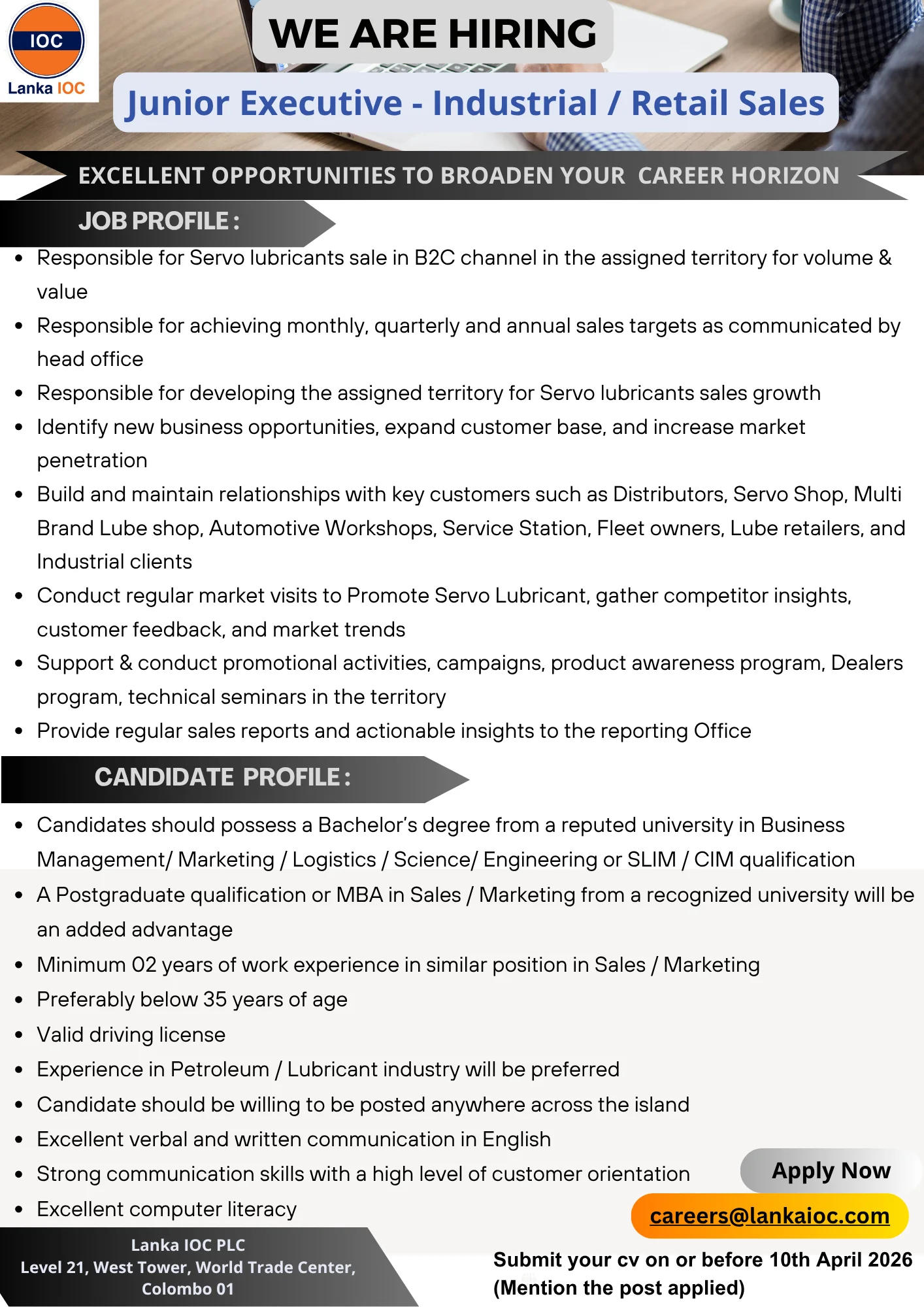 Lanka IOC Job Vacancies 2026 - Junior Executive (Industrial Retail Sales)