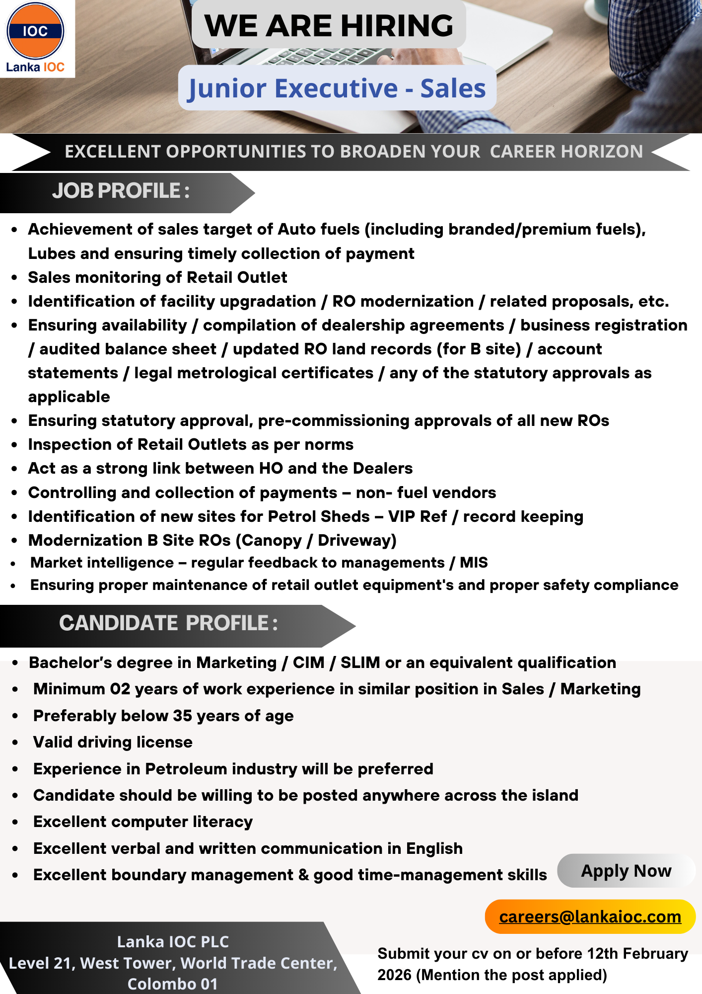 Lanka IOC Job Vacancies 2026 called for Junior Executive (Sales). Interested candidates can be apply for this opportunities.