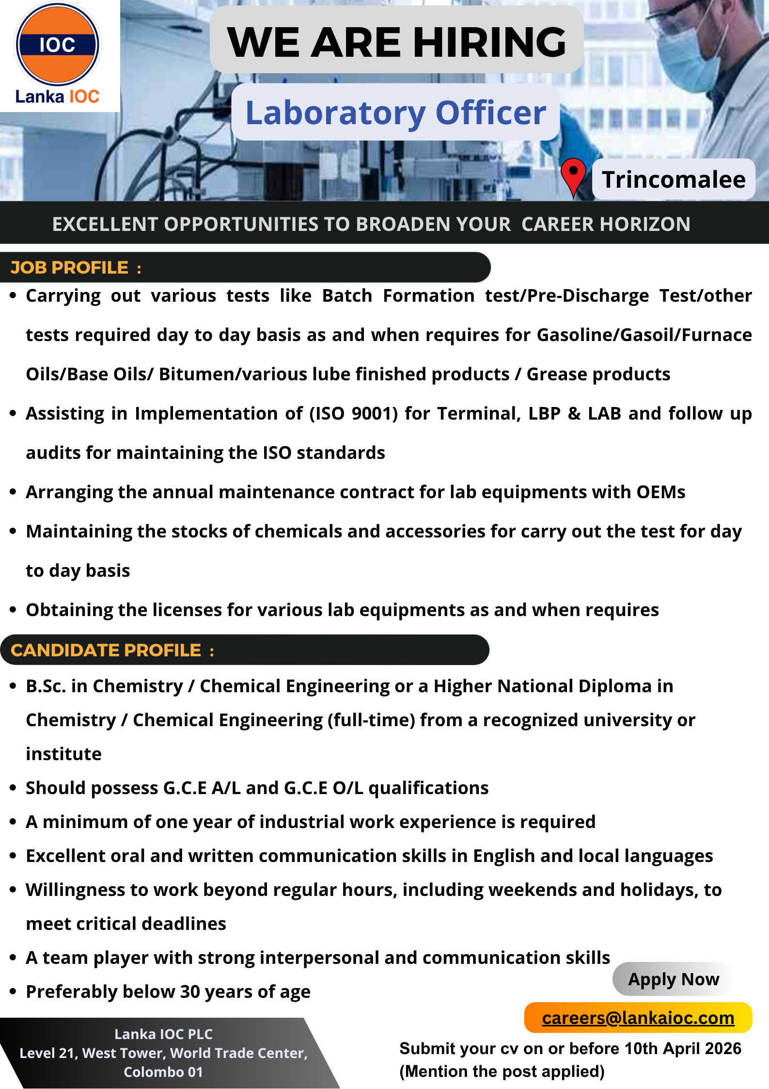 Lanka IOC Job Vacancies 2026 call for Laboratory Officer. Interesting candidates can be apply for this opportunities.