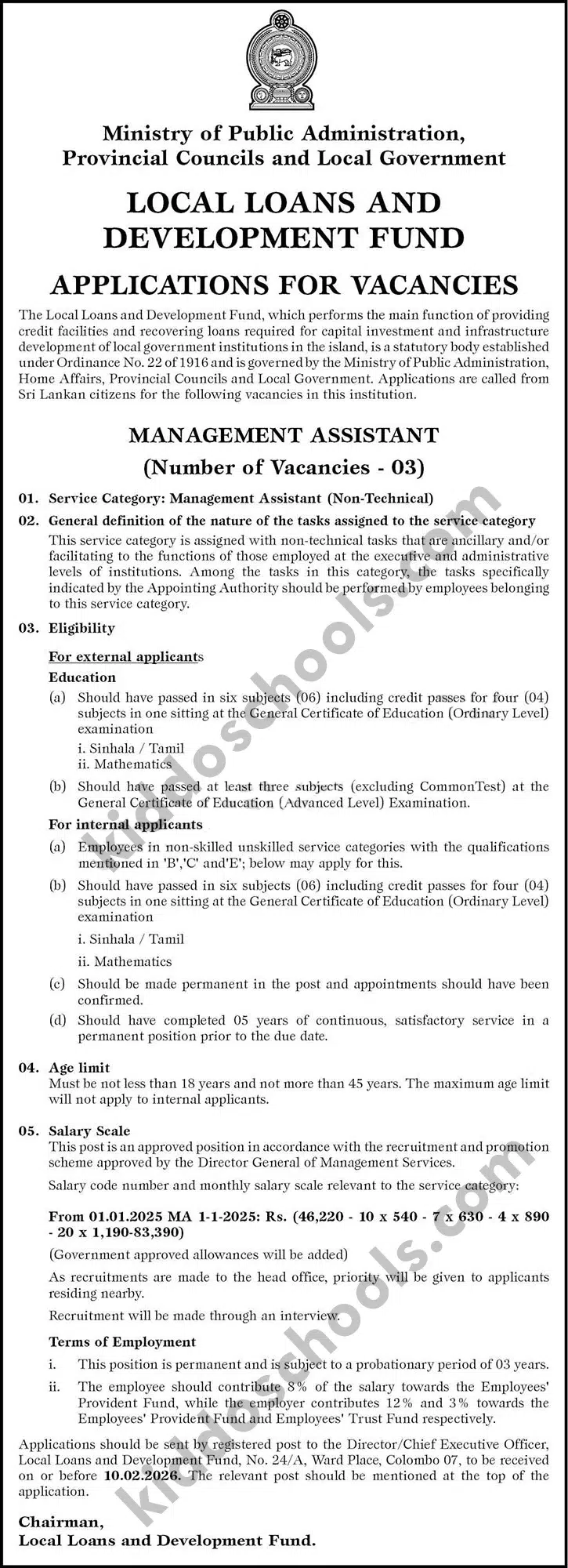 Local Loans And Development Fund Job Vacancies 2026 called for Management Assistant (Non-Technical) post. There are 3 vacancies available. So interested candidates can be apply for this opportunities.