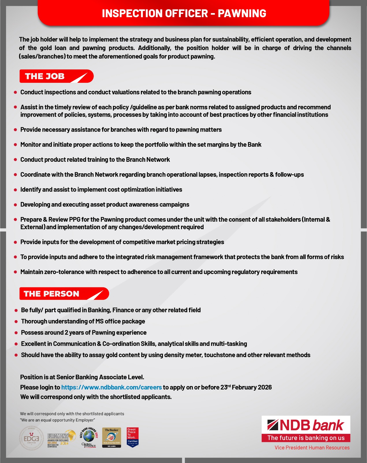 NDB Bank Job Vacancies 2026 call for Inspection Officer (Pawning). Interested candidates can be apply for this opportunities.