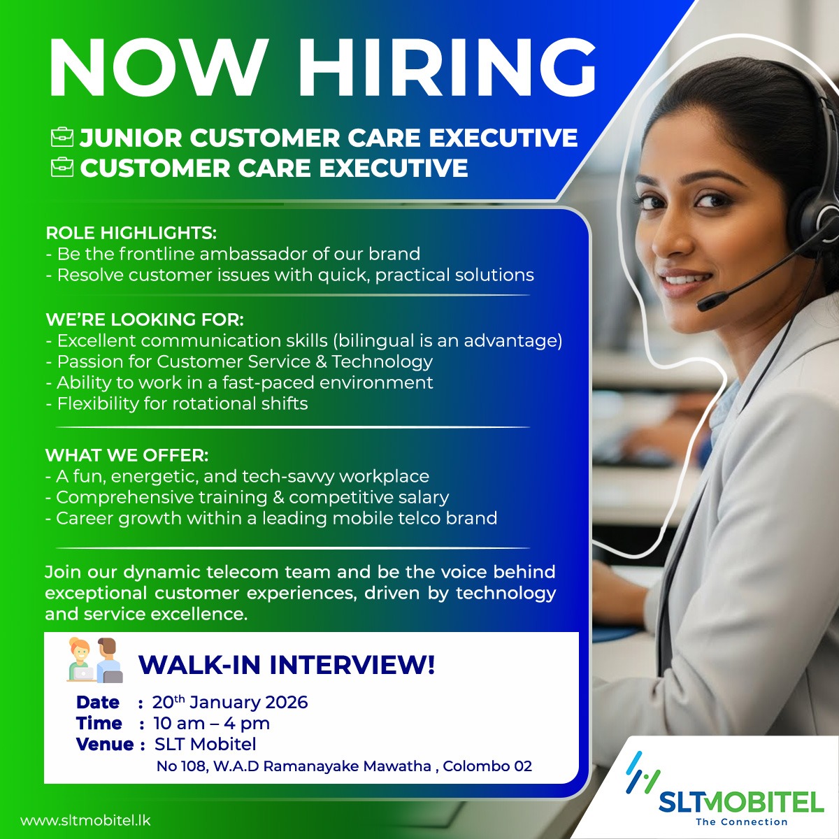 SLT Job Vacancies 2026 called for Junior Customer Care Executives and Customer Care Executives. Interested candidates can be join the Interview.